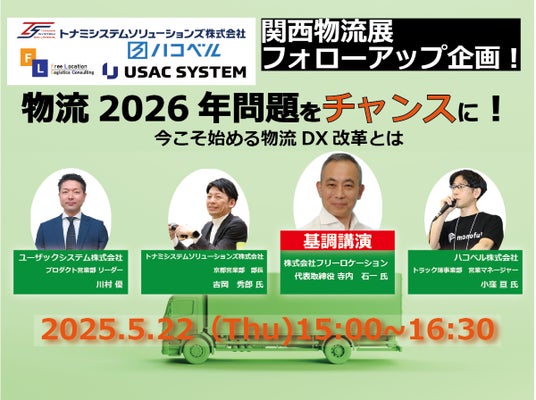業務プロセスの自動化・効率化を支援するユーザックシステム株式会社(本社:大阪市、代表取締役社長:小ノ島 尚博)は、2025年5月22日(木)15:00より、株式会社フリーロケーション代表取締役社長 寺内石一氏による基調講演「なぜ今、物流改革のチャンスなのか?~物流激動時代を乗り越えるために~」と、トナミシステムソリューションズ株式会社(本社:京都府京都市、代表取締役社長:小野 隆夫)、ハコベル株式会社(本社:東京都、代表取締役社長CEO:狭間 健志)による物流DXソリューション紹介のオンラインセミナーを開催します。