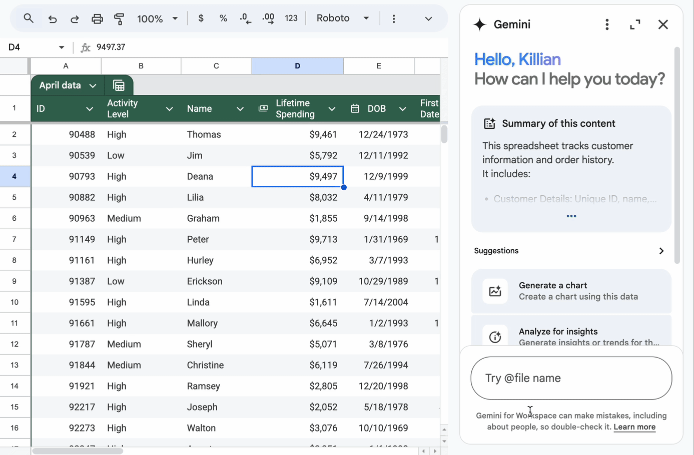 プロンプトの例:「4月に注文された商品だけを表示するようシートをフィルターして」など