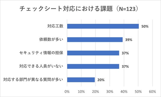 図1:セキュリティチェックシート対応における課題 ※「わからない」「上記にはない」と回答した企業68社を除いて集計 ※同一企業から複数の回答がある場合は、企業名の重複を除外して集計