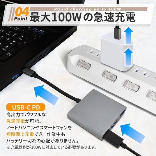 ノートPCやスマホを短時間で充電でき、作業中のバッテリー切れも防げます。