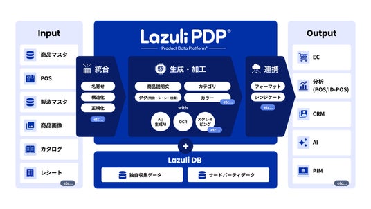 Lazuliが開発、提供する「Lazuli PDP」は、複数の外部データベースに点在していた商品情報を一括して管理し、またデータの活用方法に合わせ、利用しやすい形にデータの加工、生成を行うためのプロダクトデータプラットフォームです。メーカーや小売業者、製薬業者などが保有する多様な商品マスタデータを、AIを活用して名寄せし、効能や製品の特徴からメタタグの付与や関連付けを行います。これらの情報はLazuliが持つ商品情報データベースに格納され、「Lazuli PDP」として、ユーザーに提供されます。