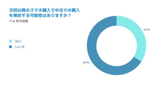次回以降のスマホ購入で中古での購入を検討する可能性が「ある」と答えた人が39人(34.2%)、「ない」が75人(65.8%)でした。