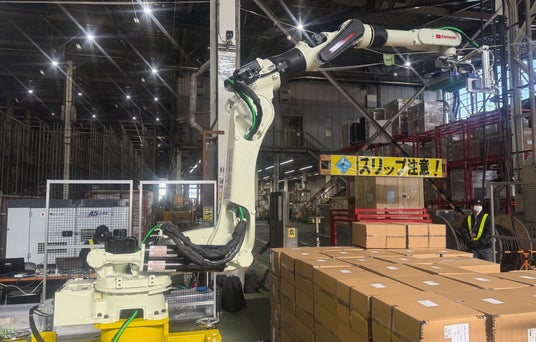 した、長いアームを有する8 軸ロボット技術を用いて、デパレタイズ作業の自動化の実現可能性を