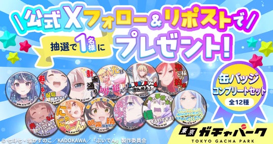 さらに、キャンペーン期間中に東京ガチャパークのX公式アカウントをフォロー&リポストすると、抽選で1名様に「名セリフ付き場面写缶バッジ」の全12種コンプリートセットをプレゼント!