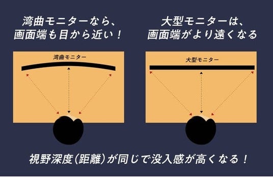 曲率1800Rは画面全体が見やすくなっています。高い没入感はもちろん、目のピント調整を最小限で全体を把握できるので、目の負担を軽減できます。画面の中央と端で距離差が少なく、ピント調整を最小限に、映像体験の没入感が高くなります。