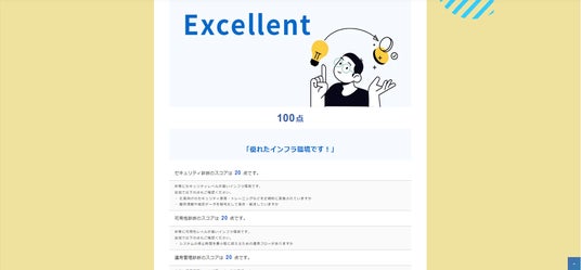 このたび公開した診断ページでは、社内ITインフラ環境を「セキュリティ」や「コスト管理」などの観点から総合的に診断します。診断は設問にチェックを入れるだけ、数分で完了。結果とともに具体的な改善ポイントが提示されるため、企業のIT担当者にとって非常に有用なツールとなっています。