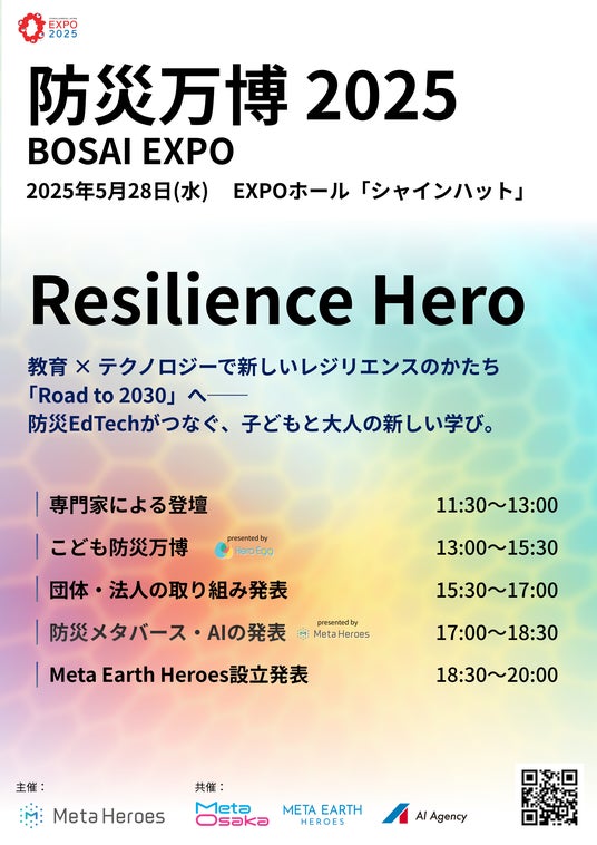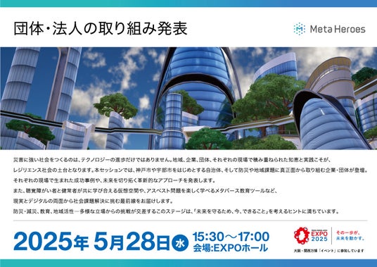2025年5月28日(火)、大阪・関西万博「EXPOホール」にて開催される一般催事「防災万博」において、株式会社Meta Heroes(本社所在地:大阪府大阪市、代表取締役:松石和俊、以下「当社」)は、15:30~17:00にかけて、自治体・企業・団体による最先端の社会実装事例を紹介するセッション「団体・法人の取り組み発表」を開催いたします。