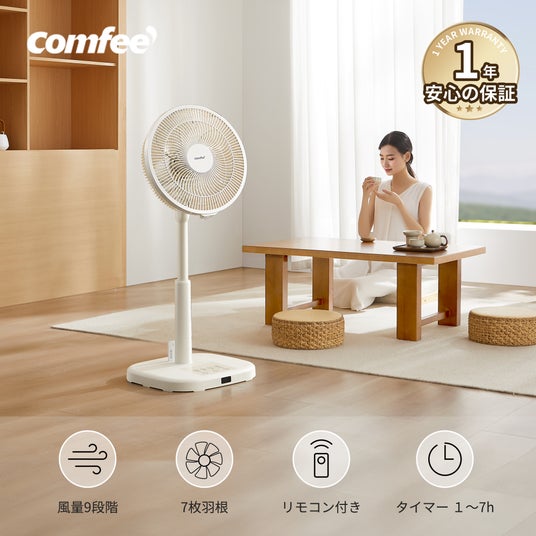 COMFEE' DC扇風機は85°広角自動首振りと30dB静音設計を搭載し、リモコンで9段階風量・7時間タイマーを簡単操作。キッチンからバスルームまで快適な風を届けます。