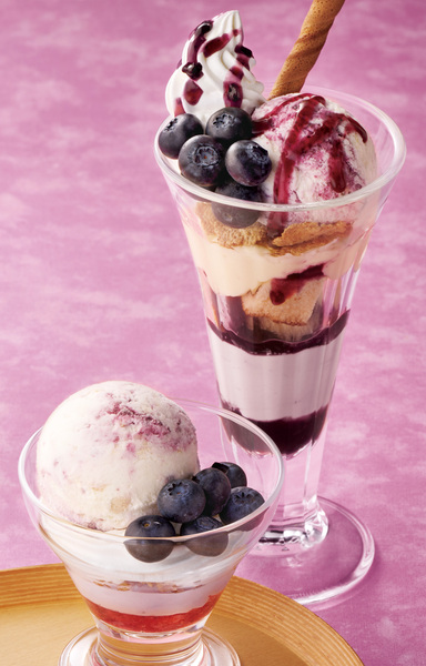 デザートには、弾ける食感が楽しめるフレッシュブルーベリーを使用した「ブルーベリーのレアチーズパフェ」(735円)と「ブルーベリーのミニパフェ」(482円)を用意している。