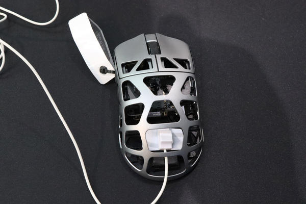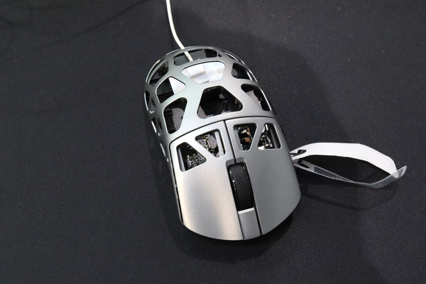 FIERCE Xは、ボディー材料にマグネシウム合金を採用したゲーミングマウス。マグネシウム合金の強度を生かした大胆な肉抜き型で、42g(±2g)という超軽量を実現しています。形状は左右対称タイプで、サイズは119.57×60.99×36.26mm。