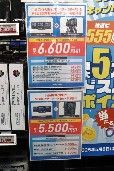 さらにお買い得情報として、ドスパラ大阪・なんば店では現在、特定のCPUとマザーボードをセットで購入すると値引きになるキャンペーンを実施中。これらのキャンペーンは重ねて利用することも可能です。