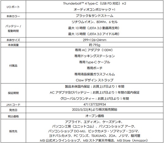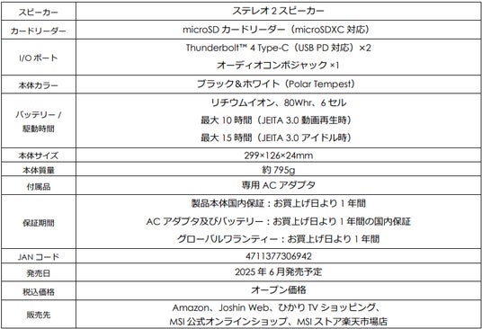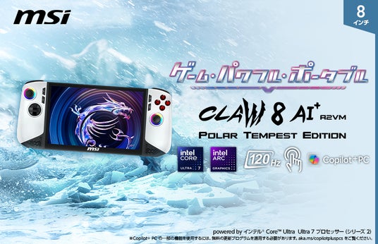 この度、エムエスアイコンピュータージャパン株式会社は、「インテル(R) Core(TM) Ultra プロセッサー(シリーズ 2)」を搭載することでゲーミング性能が向上したMSIポータブルゲーミングPC「Claw 8 AI+ A2VM」のスペシャルカラーモデル(Polar Tempest Edition)が2025年6月頃に発売予定となることを発表いたします。この他、「Claw 8 AI+ A2VM」に専用ドッキングステーションなどがセットになった豪華パックモデル(Super Pack)を2025年5月22日(木)より順次販売開始いたします。