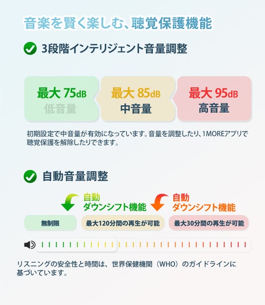 【WHO基準に基づく聴覚保護と自動音量調整】