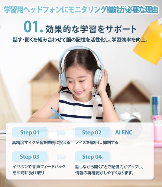 イヤーパッドの優れた遮音性で、周囲の音を効果的に遮断し、子供が集中できる環境づくりをサポート。セルフボイスモニタリング使用時もAI ENCによってノイズを軽減し、クリアな音声がモニタリング可能です。