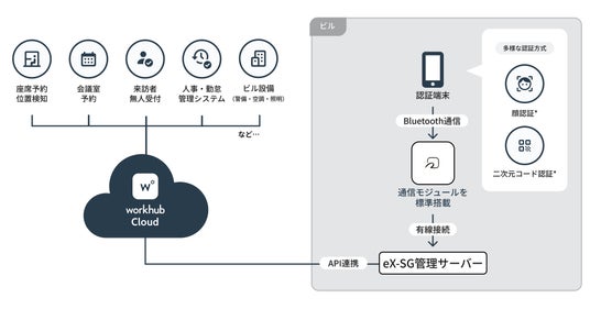 本サービスは、ビットキーのコネクトプラットフォーム「workhub」とパナソニックの入退室管理システム「eX-SG」が連携した次世代の統合型ビル入退室サービスです。「eX-SG」管理サーバーはビットキーが提供する「workhub Cloud」とAPI連携し、カードリーダーには通信モジュールを標準搭載しています。