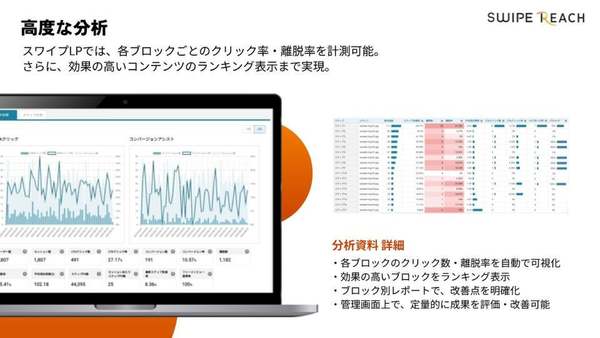 「スワイプリーチ」は、スマートフォンユーザーが日常的に行うスワイプ操作をLPに応用したUX設計を採用。1画面=1コンテンツの構成にすることでユーザーの読み飛ばしや離脱を防ぎ、各ブロックの閲覧データをもとに効果的な改善を図り、広告成果の最大化と運用効率を同時に向上することを目指すという。
