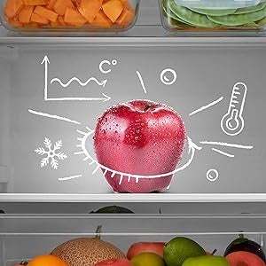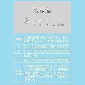冷蔵室の温度調節はワンタッチ操作で簡単。ボタンを押すごとに、**設定温度を示すランプが点灯し、現在の温度レベルを一目で確認可能。**季節の変化や食材の量に応じて、最適な庫内温度に手軽に調整でき、いつでも新鮮な状態を保ちます。
