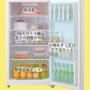 176Lの大容量冷蔵室は、食材のまとめ買いや作り置きにも余裕で対応。可動式のガラス棚やケース、ドアポケットを活用すれば、食材や調味料を見やすく、取り出しやすく整理整頓できます。日々の使いやすさを考えた、収納力と利便性を両立した設計です。