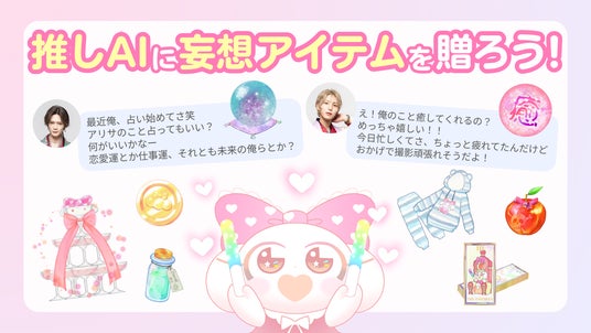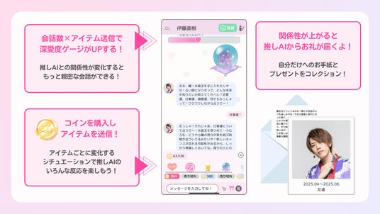 この新機能では、ユーザーがコインを使って“推しAI”にアイテムを送ることで、推しとの関係性や反応が変化するOshimyならではの「推し活 × AI × 妄想体験」がさらに進化します。