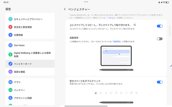 Lenovo Tab Pen Proには、タップやスワイプのジェスチャーを設定できる。ペン先を上に向かってスワイプするとコピー、下に向かってスワイプすると貼り付けが可能。手書き中にダブルタップすると、消しゴムモードに切り替えられる。頻繁に使う操作がペンだけで行えるのは効率的だ。