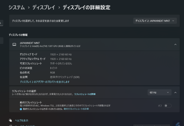 PC側で「ディスプレーの詳細設定」を見ると、出力先の解像度(1920×2160ドット)が反映されていた。ノートPCなら接続してから画面の複製や拡張といった設定を行う必要はあるが、どちらか一方を選ぶだけの単純作業なので面倒ではないはずだ。