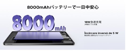 長時間使用を可能にする8000mAhバッテリーと、18Wの急速充電に対応しており、外出先や移動中でも安心して使用可能です。また、デュアルスピーカー、顔認証、3.5mmイヤホンジャックなど、使い勝手にも配慮された設計が魅力です。
