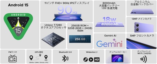 最新Android 15 × Google Gemini AI搭載、11インチ90Hz液晶・大容量バッテリー・高性能メモリを備えた万能ハイスペックモデル