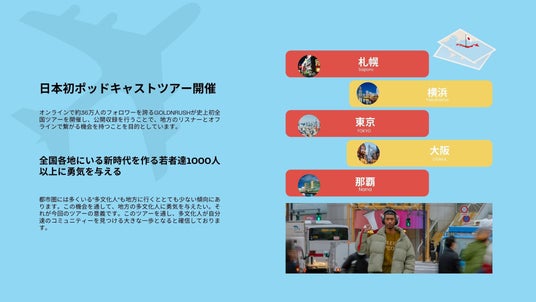 GOLDNRUSH Podcast(株式会社GOLDNRUSH)は、チャンネル開設3周年を記念し、ミックスルーツや多文化背景を持つ人々が“リアルに出会える場”をつくる全国公開収録ツアーを開催します。本ツアーは、札幌・東京・大阪の3都市を皮切りに、最大5都市での開催を目指すリアルイベントプロジェクトです。ツアー実現に向けて、2025年5月17日(土)よりCAMPFIREにてクラウドファンディングを開始しました。