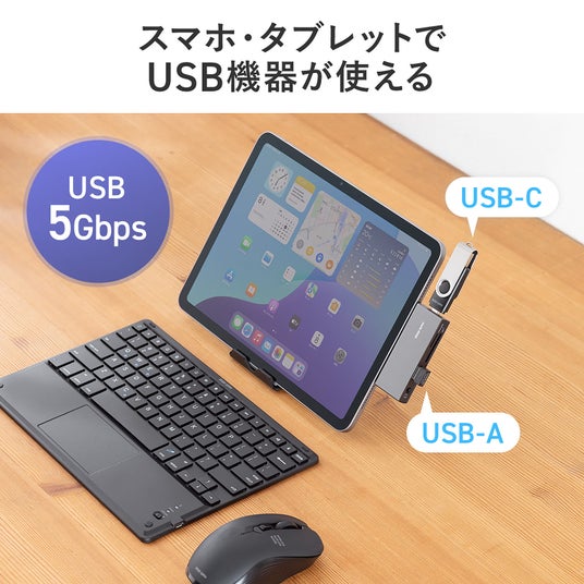 USB 5Gbps(USB 3.2 Gen1)の速度のUSB-A・USB-Cを1ポートずつ搭載し、USBメモリやキーボード、マウスなどを接続することができます。USB-CポートはPD充電にもUSBポートとしてもどちらも使えます。