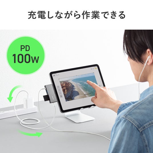 USB-CポートはPD(Power Delivery)100Wに対応。ノートPCやスマホ、タブレットを充電しながら他のデバイスも同時に使用可能です。たとえば、動画鑑賞中に充電しつつイヤホンで音声を楽しむ、といった使い方も可能です。
