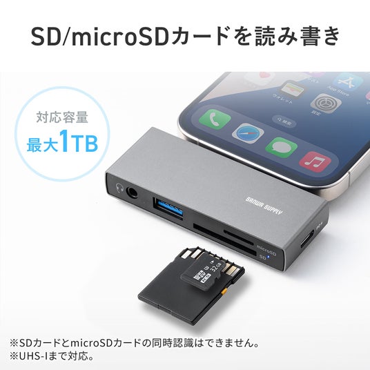 最大1TBまで対応のSD/microSDカードスロットを搭載し、大容量データの読み書きもスムーズ。写真や動画のバックアップはもちろん、外出先での資料編集やデータコピーも簡単。UHS-I対応で高速転送を実現します。
