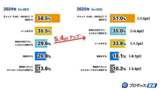 今年の調査では、1位は依然として「チャット」でしたが、利用率が7.5ポイント減少しました。一方で、2位には「専用の打刻アプリ・システム」が5.4ポイント上昇してランクインし、昨年の3位から順位を上げる結果となりました。3位には「メール」が入りましたが、利用率は昨年より1.7ポイント減少しました。