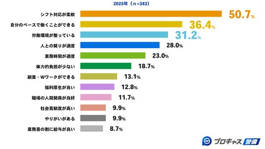 1位「シフト対応が柔軟(50.7%)」、2位「自分のペースで働くことができる(36.4%)」、3位「労働環境が整っている(31.2%)」と続きます。