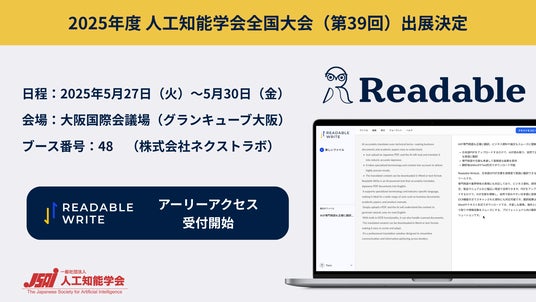 高精度なAI翻訳を実現する「Readable」を開発・提供する株式会社ネクストラボ(本社:東京都渋谷区、代表取締役:亀井智英、以下「ネクストラボ」)は本日、2025年5月27日(火)~30日(金)に大阪国際会議場(グランキューブ大阪)で開催される「2025年度 人工知能学会全国大会(第39回)」(以下、JSAI )への出展を発表いたしました。あわせて、現在開発中で日本語から英語へのプロフェッショナルレベルの翻訳を提供する「Readable Write」についてもアーリーアクセスの受付を開始したことをお知らせします。