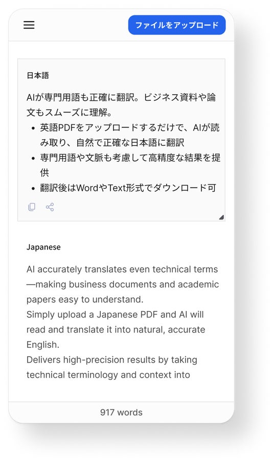 Readable Writeでは、日本語のドキュメントをアップロードするだけでテキストを自動で抽出し、自然な英語に翻訳することが可能です。また、抽出した文章に対して、高精度なAIが文法や語彙、トーンを自動で改善し、提案された文章を自分で自由に表現を編集することも可能です。利用ケースとしては、海外で発表する日本語論文の翻訳や専門性の高い技術文書の英語化、また、ビジネス文書や自然なトーンのメール作成、インバウンド外国人向けの多言語案内資料や自治体における防災マニュアルなど多岐にわたる用途が想定されています。