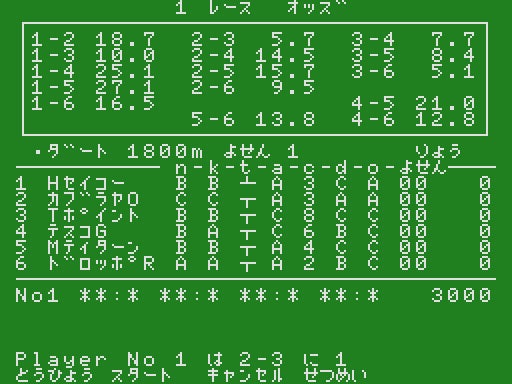 本作は1983年にリリースされた競馬ゲームです。プレイヤーは3000円の所持金を手に予選から決勝までの7レースを予想していきます。1レースにつき4通りまでの予想が可能で、100円単位での投票ができます。予想の際はオッズ、血統、脚質、安定度、調教などの様々なデータを参考にすることができます。