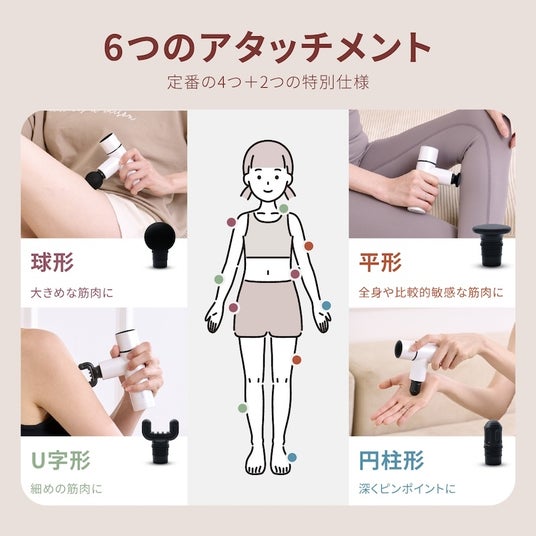 定番の四つ(球形、平形、U字形、円柱形)+二つの特別仕様(フェイス用、温熱ヘッド)の計6種を用途に合わせて付け替え可能。