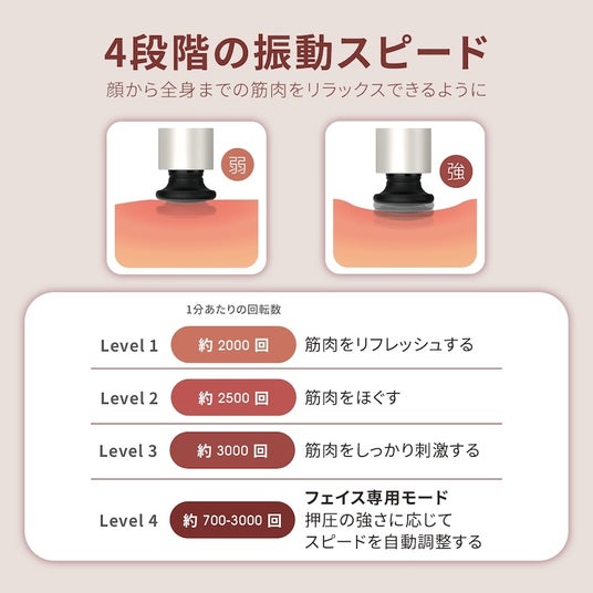 部位や用途に応じて振動強度を調節可能(最大約3000回/分の強力振動から、顔用の低速「フェイスモード」まで搭載)