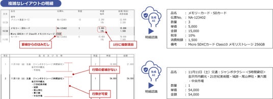 準定型帳票のOCRに対応する「エントリーアプリケーション」に、新たに生成AI連携機能(オプション)(注4)を実装しました。請求書や注文書などに含まれる複雑な明細項目を高精度に読み取ります。項目名が複数行にまたがるケースや、一行に複数の情報が混在しているケースでも、明細項目として整理された形式で出力します。