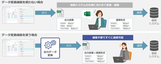 さらに、「出力データ変換」機能を新たに搭載。後続システムに最適化された出力形式に自動で変換するよう、カスタマイズが可能になり、スムーズに連携できるようになります。これにより、後続システムに合わせるための編集が不要になり、業務フローがより一層効率化されます。