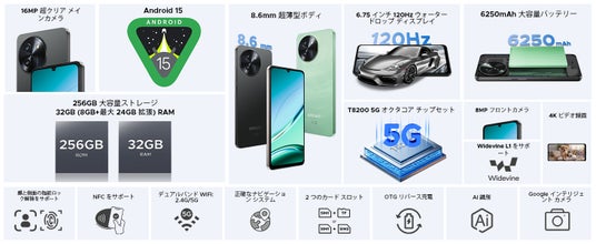 ・6.75インチHD+ 120Hzディスプレイ:滑らかな操作感と映像体験。