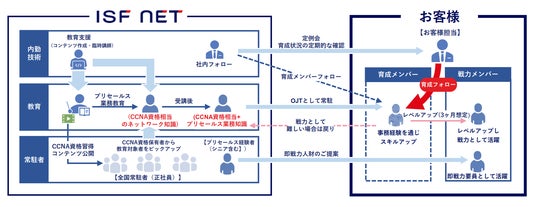 本プロジェクトでは、アイエスエフネットの持つ豊富な人財と育成ノウハウを活かし、プリセールスエンジニアの素養を持つ人財を短期間で育成します。具体的には以下のスキームで実施します。
