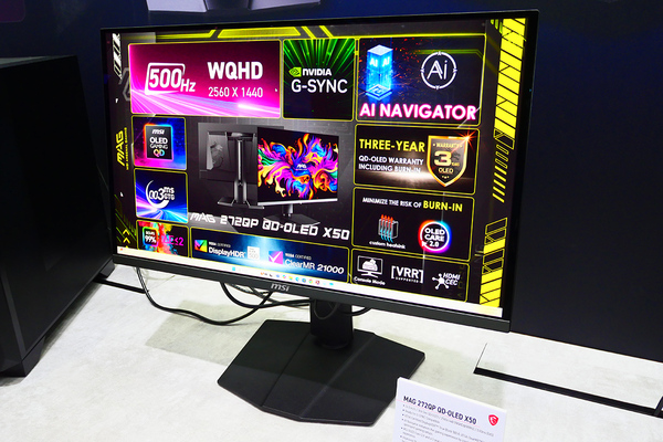 続いて紹介したいのが、26.5型でQD-OLEDパネルを採用するWQHDディスプレー「MAG 272QP QD-OLED X50」。ぱっと見た瞬間に「めっちゃキレイ!」とつぶやいてしまうほど発色に感じた。本機は、HDR True Black 500に準拠しているほか、モーションブラーを評価するための規格「VESA Clear MR 2100」も取得している。