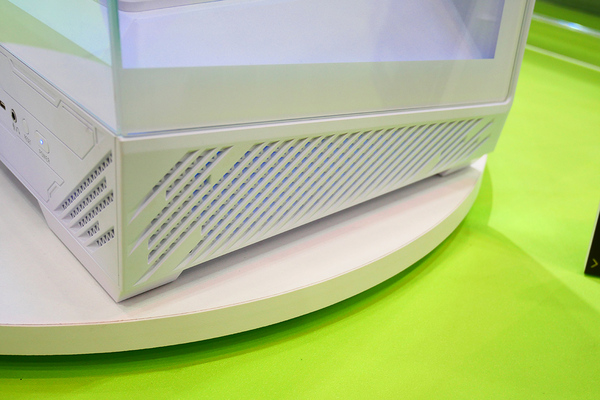 また、MAG X870E TOMAHAWK WIFI PZをATXケース「MAG PANO 130R PZ」に組み込んだパソコンも展示してあった。前面もガラスパネルを採用するピラーレスケースで、インターフェースは左サイド下部に配置。前面の吸気口部分は斜めになっており、これはTOMAHAWKをはじめとしたマザーボードのIO部分のヒートシンクの斜めのデザインと合うように設計しているとのことだ。