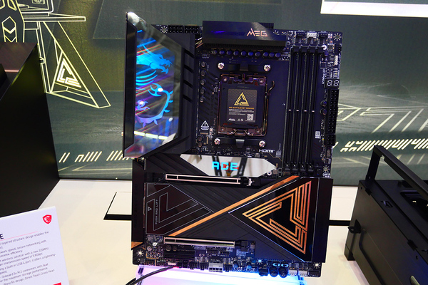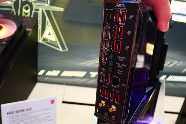 続いて展示してあったのが、X870Eマザーボード「MEG X870E ACE」。こちらのIOパネルのヒートシンク部分にデザインされたドラゴンは、複数の層に分かれていることによって、ドラゴンが浮かび上がっているように見える。M.2のヒートシンクには、ACEと浮かび上がるのもポイントだ。