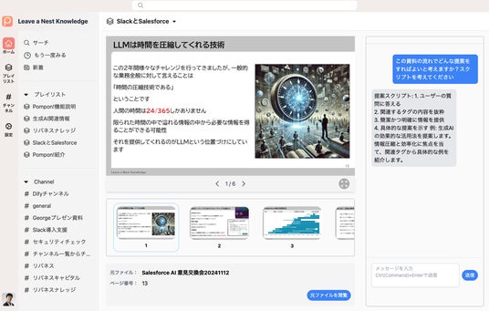 株式会社リバネスナレッジ(本社:東京都新宿区、代表取締役社長:吉田 丈治)は、生成AIを活用した革新的な知識探索プラットフォーム「Pompon!」の正式リリースを発表いたします。Pompon!は、組織内に散在する膨大なドキュメントをAIが解析し、必要な情報を瞬時に提供することで、情報探索の効率化、情報共有の促進、組織全体の生産性向上、そして、営業活動にはコンテンツ管理と共有に特化したセールスイネーブルメントツールとしても強力に貢献します。