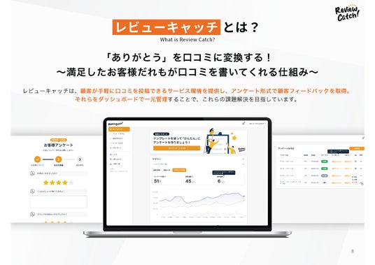 「すべての"ありがとう"を口コミに転換する」をキャッチコピーに、店舗改善につながる「お客様アンケート」とウェブ集客で重要な「Google口コミ」を同時に収集することが可能になります。