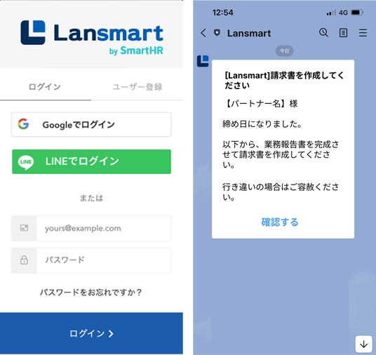 業務受託者はLINEアカウントだけでLansmart by SmartHRにログインできます。 さらに、LINE連携を行っていただくことで、発注書の承認・請求書の作成/提出・支払通知書の承認依頼の催促がLINEで通知されます。
