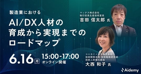 株式会社アイデミー(本社:東京都千代田区、代表取締役 執行役員 社長 石川聡彦、以下「アイデミー」)は、2025年6月16日に第4回経団連後援セミナー「製造業におけるAI/DX人材の育成から実現までのロードマップ」を開催いたします。コニカミノルタ株式会社(本社:東京都千代田区)とマックス株式会社(本社:東京都中央区)をゲストに迎え、現場での実践を通じて得た知見や、育成からDXプロジェクト実現に至るまでのリアルなプロセスについて共有いたします。