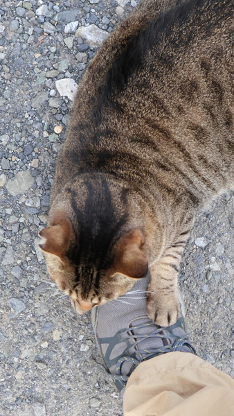 頑丈な靴を履いていてよかった。そうこうしてたら、ご近所の方らしき女性がおふたりやってきたので挨拶すると、ひょいとしゃがんでうれしそうに猫を撫でだしたのである。片方はサンダル履きだったけど、猫は爪を研ぎにいかず。ちゃんとわかってるようである(冒頭写真)。えらいもんだ。